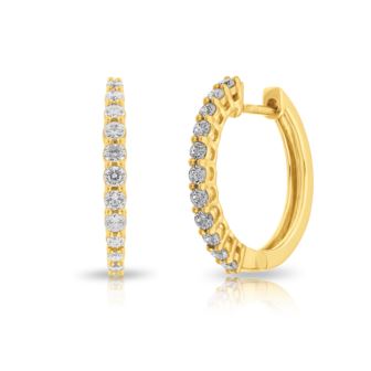 Round Diamond Hoop Earrings in 10K Yellow Gold 0.50ct, Color-IJ, Clarity-I2. These gorgeous diamond hoop earrings feature round diamonds in a 10k white gold setting. The total carat weight of the diamonds is 0.50ct. These earrings make for a stunning addition.