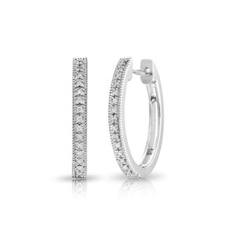 Round Diamond Hoop Earrings in 10K White Gold 0.10ct, Color-IJ, Clarity-I2. These gorgeous diamond hoop earrings feature round diamonds in a 10k white gold setting. The total carat weight of the diamonds is 0.10ct. These earrings make for a stunning addition.
