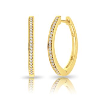 Capture her heart with the delicate allure of these diamond hoop earrings, embraced in the enchanting glow of 10K yellow gold. Each curve of these hoops whispers of a love story, woven with the timeless elegance of devotion. Adorned with a mesmerizing array of diamonds totaling 0.20 carats, these earrings radiate a gentle sparkle, mirroring the depth of your affection. Set in the captivating hues of IJ color and boasting the clarity of I2, each diamond embodies the purity of your bond, illuminating her beauty with every glance. As she adorns herself with these exquisite hoops, let them serve as a cherished symbol of your unwavering commitment, a promise of forever sealed in the brilliance of the diamonds. Gift her not just jewelry, but a token of your eternal love, destined to shimmer with every step of your journey together.