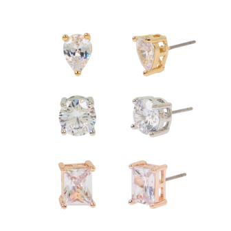 Jessica Simpson stud earrings set featuring round, rectangle and teardrop shaped crystal CZ stones with tri-tone hardware details. Pierced with post back. Set includes 3 pairs of earrings.