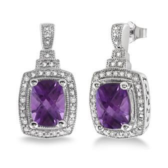 Passionately purple and timelessly elegant. Genuine cushion cut 8x6mm purple amethyst earrings with .10twt round diamonds set in sterling silver. Heavy friction backs for added security. Matches well with necklace JN810 and ring JR810.