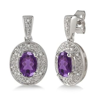 Passionately purple and exquisitely beautiful amethyst and diamond earrings. .10twt round diamonds with genuine 7x5mm oval amethysts set in sterling silver. Matches well with necklace JN812 and ring JR812.