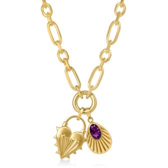 This 18" long, 14k yellow gold vermeil necklace blends playfully oversized cable links with powerful symbolism. A spiked heart pendant channels fierce love, while a radiant amethyst pendant glows with warmth, wisdom and vintage charm. The pendants are secured to the necklace by a push-gate ring, meaning that you can remove the pendants to and from the necklace as you wish. Wear it as a tribute to the bold, the brave, and the beautifully untamed. Secures to the neck with a lobster claw clasp.