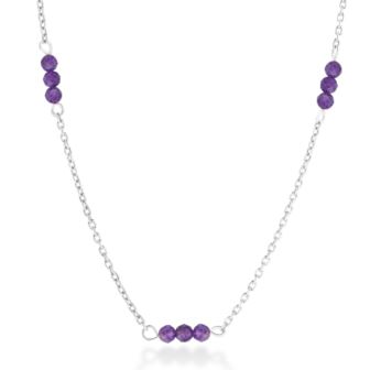A necklace where the glimmer of gold balances the luster of Amethysts. Take these amethyst beads out for a spin on a sterling silver chain that goes with everything. 2.5-3mm amethyst bead stations. Sterling Silver. 18" in length. Secured to the neck with a lobster claw clasp.