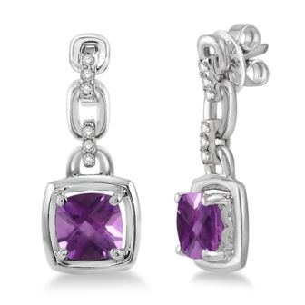 Elegant gemstone and diamond earrings feature 6x6mm genuine amethyst and .08twt round diamonds set in sterling silver. These beauties glisten as they move throughout the day.