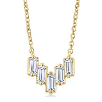 Sleek and sculptural, this 14k yellow gold chevron necklace features five baguette-cut diamonds arranged in a modern stepped design. With .25twt of radiant sparkle, its geometric silhouette adds contemporary elegance to any neckline. Suspended from an adjustable 18" cable chain, this versatile piece balances bold sophistication with refined minimalism, making it a striking choice for everyday wear or evening glamour.