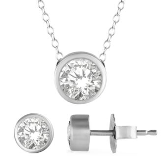 Simple perfection. Catch the light and make it dance with these beautiful bezel-set .50twt round brilliant-cut diamond earrings and .25ct round brilliant cut diamond pendant in 14k white gold. 18" cable chain with a lobster claw clasp.