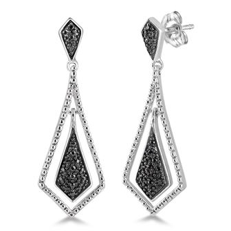 Elegant and fun... all at the same time with these stunning black diamond drop earrings. .10twt round black diamonds set in sterling silver. Matches well with necklace JN873.