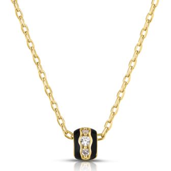 This necklace features a black enamel rondelle encrusted with white cubic zirconia's. Set on a 14k yellow gold plated brass cable chain, wear the necklace with or without the rondelle, or go for a maximalist look by layering with chains and chokers. 14k yellow gold plated brass. 16" length with a 2" extender. Secured to the neck with a spring ring clasp "
