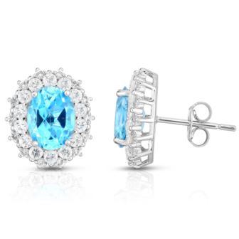 Classic meets chic- with these beautiful blue topaz earrings. 8x6mm blue topaz are surrounded by genuine white topaz for added sparkle. Set in sterling silver.