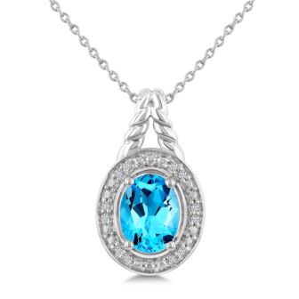 Elegantly crafted in rhodium-finished sterling silver, this pendant features a luminous 9x7mm oval-cut blue topaz framed by a halo of sparkling diamonds (.02twt). The twisted rope bail adds artisanal detail, while the 18" cable chain ensures versatile wear. A piece that radiates timeless beauty, it's perfect for adding a touch of sophistication to every occasion.
