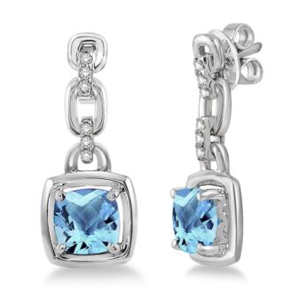 Elegant gemstone and diamond earrings feature 6x6mm genuine blue topaz and .08twt round diamonds set in sterling silver. These beauties glisten as they move throughout the day.