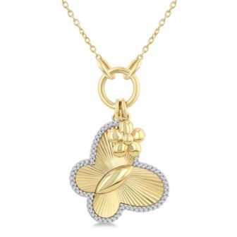 Radiating elegance and charm, this 10k yellow gold butterfly pendant necklace captures nature's beauty with a modern touch. The fluted design shimmers with delicate texture, outlined by 1/6 twt diamonds that sparkle like morning dew. Suspended from an 18" cable chain with jump-rings at 16" and 17" for layering versatility, this necklace evokes whimsy, transformation, and timeless grace. A luminous symbol of renewal, it's a piece destined to uplift every look with effortless brilliance.