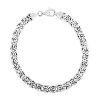 Bold, beautiful, and regal, this sterling silver with yellow gold overlay Byzantine link bracelet with a chunky contemporary clasp is intricate, sturdy, and makes a strong enough statement worn alone but can be layered perfectly with other bracelets. Sterling silver with yellow gold overlay; Bracelet Length: 7.75"; Bracelet Width: 10mm; Clasp Mechanism: lobster claw clasp