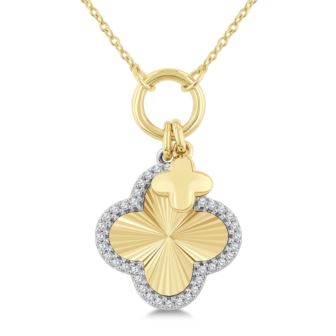 Symbolizing luck and elegance, this 10k Yellow Gold Clover Charm Pendant necklace is accented with 1/6 twt diamonds for a radiant finish. The fluted design adds dimension and shimmer, while the polished gold clover creates a striking layered effect. Suspended from an 18" cable chain with jump-rings at 16" and 17" for layering versatility, it's the perfect piece to bring everyday luxury and meaningful style to your collection.