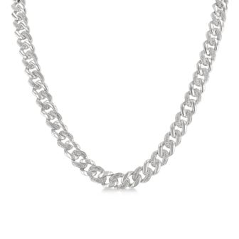 Command attention with this 18" sterling silver Cuban link necklace, where sleek geometry meets diamond sparkle. Alternating polished and pavé-set links shimmer with .25twt round cut diamonds, creating a bold yet refined rhythm of light. Finished in radiant rhodium, this modern classic can be worn alone as a powerful statement or layered for elevated style. A perfect blend of strength and sophistication.