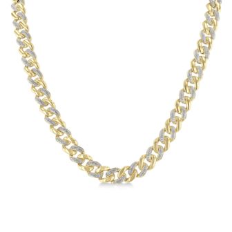 Command attention with this 18" yellow gold plated sterling silver Cuban link necklace, where sleek geometry meets diamond sparkle. Alternating polished and pavé-set links shimmer with .25twt round cut diamonds, creating a bold yet refined rhythm of light. This modern classic can be worn alone as a powerful statement or layered for elevated style. A perfect blend of strength and sophistication.