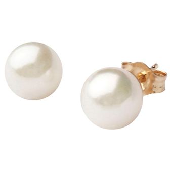 Classic but cool pearl studs. 8.5-9mm cultured pearl earrings, 14k yellow gold posts and backs. These pretty earrings will dress up that black dress or a pair of jeans.