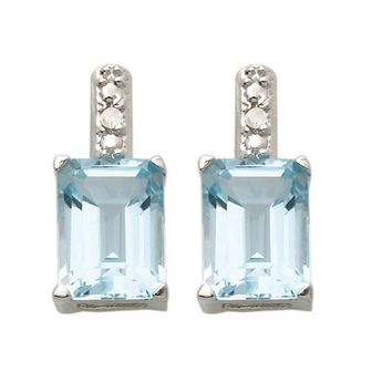 Emerald cut for broader, more brilliant flashes of light. Lovely 8x6mm genuine emerald cut blue topaz earrings with .02twt round diamonds set in sterling silver. Matches well with necklace JN249-BT.