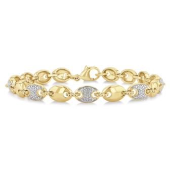 Sleek and striking, this yellow plated sterling silver mariner link bracelet symbolizes strength and timeless connection. Alternating polished and diamond-accented links shimmer with .10twt of pavé-set diamonds, while textured connectors add depth and character. Secured with a lobster clasp, this 7" bracelet blends bold design with refined elegance-perfect for making a powerful style statement.