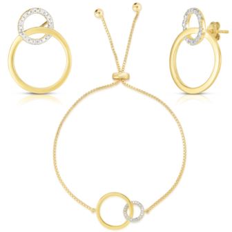 Circles and more circles--geometric, infinity--you choose the meaning that most reflects you! One thing is for sure: You can't go wrong with this stunning diamond bracelet and earring set. This bold sterling silver diamond interlocked circle bolo bracelet is adjustable to fit most wrists, and the versatile box chain can easily be worn alone or layered with cuffs, pearls, and more! The classic open circle design is embellished with .10twt brilliant-cut diamonds, giving a dazzling effect.