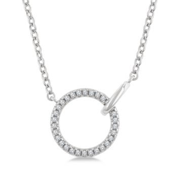 Crafted in rhodium-finished 10k white gold, this interlocked circle necklace embodies love, unity, and continuity. One polished gold circle links seamlessly with a diamond-studded counterpart, shimmering with 30 sparkling diamonds (.10twt). Suspended from an adjustable 18" cable chain, this elegant pendant is both meaningful and versatile-a timeless treasure to celebrate enduring bonds.