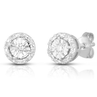 Classic solitaire stud earrings with diamond cut details for added sparkle. .15twt diamonds set in sterling silver. Add a touch of subtle sophistication to every outfit.