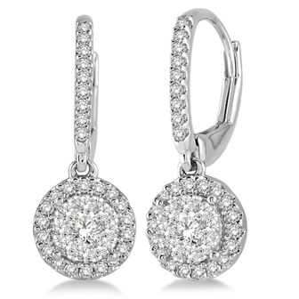 Beautiful diamond cluster earrings with luxurious diamond halos and diamond Euro wires, .40twt round diamonds set in 14k white gold. Matches well with necklace JN670-W and ring JR670-W.