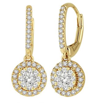 Beautiful diamond cluster earrings with luxurious diamond halos and diamond Euro wires, .40twt round diamonds set in 14k yellow gold. Matches well with necklace JN670-Y and ring JR670-Y.