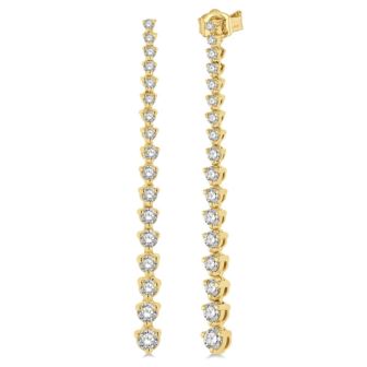 Seriously stunning and truly tempting, these round diamond dangle drop earrings are the epitome of opulence and sophistication. Designed with a graduated silhouette, these 14k yellow gold linear drop earrings feature 1.00twt glittering round diamonds prong set in a statement shape and joined together with delicate gold loops to give them movement.Also available in 14k white Gold.