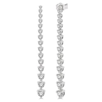 Seriously stunning and truly tempting, these round diamond dangle drop earrings are the epitome of opulence and sophistication. Designed with a graduated silhouette, these 14k white gold linear drop earrings feature 2.00twt glittering round diamonds prong set in a statement shape and joined together with delicate gold loops to give them movement. Also available in 14k Yellow Gold.