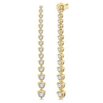 Seriously stunning and truly tempting, these round diamond dangle drop earrings are the epitome of opulence and sophistication. Designed with a graduated silhouette, these 14k Yellow gold linear drop earrings feature 2.00twt glittering round diamonds prong set in a statement shape and joined together with delicate gold loops to give them movement. Also available in 14k White gold.