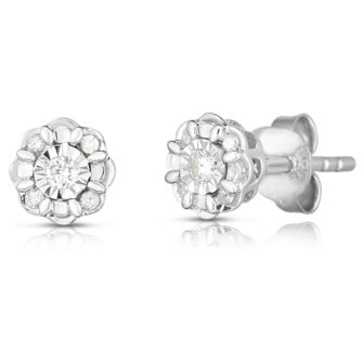 Diamond studs with a delicate scalloped design and diamond cutting- the extra details radiant throughout these beauties. .10twt round diamonds set in sterling silver.