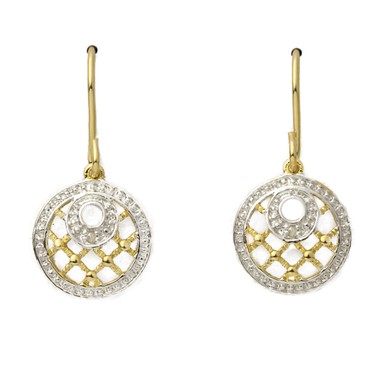 A mixed medley of dynamic detailing and distinctive style. Diamond dangle earrings, sterling silver with 14k yellow gold overlay, .02twt round diamonds. Matches well with necklace JN703.