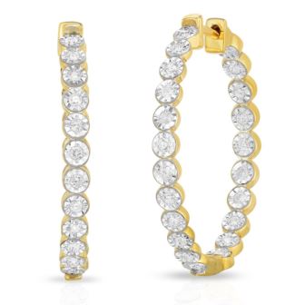 .75twt inside-out diamond hoops- the diamonds are set in miracle plates giving the earrings a pretty flower motif and the appearance of double the diamond carat weight. 10k yellow gold. Matches well with bracelet JB2719-Y.