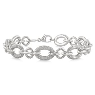 A testament to subtle luxury and enduring style, this diamond bracelet is destined to become a signature accent with every wear. Embodying the essence of refined contrast, it marries bold contours with delicate sparkle. 8 bold oval links, each adorned with 4 pave set single cut diamonds, total 32, alternate with 8 sleek, rope-textured circular links to form a rhythmic chain of metal and light. Plain silver D-link connectors join each element, allowing the bracelet to drape fluidly across the wrist. A lobster-clasp closure ensures a secure fit. The diamon