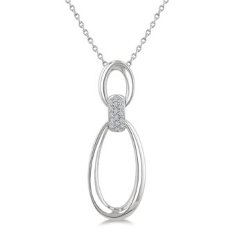 Bold yet refined, this sterling silver pendant features two polished oval links connected by a diamond-accented bridge. With .10twt of pavé-set sparkle, it blends clean modern lines with subtle brilliance. Suspended from a sleek 18" cable chain, this versatile design transforms everyday looks into a statement of effortless sophistication.