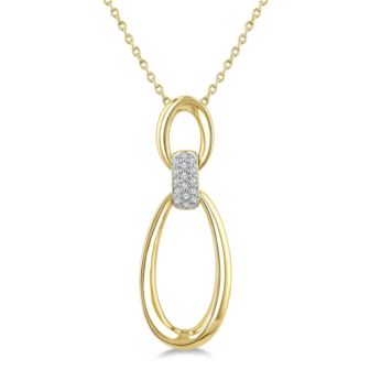 Bold yet refined, this yellow gold plated sterling silver pendant features two polished oval links connected by a diamond-accented bridge. With .10twt of pavé-set sparkle, it blends clean modern lines with subtle brilliance. Suspended from a sleek 18" cable chain, this versatile design transforms everyday looks into a statement of effortless sophistication.