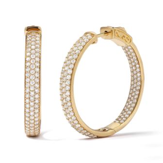 Diamond pave detail inside and out for dazzle you're dreaming of, with the same classic appeal you can't get enough of. 2.40twt round diamonds are hand-set in lustrous 18k yellow gold for a bold, beautiful and timeless hoop earring. Secured to the ears by a lever back closure.