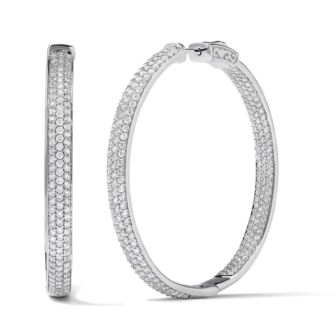 Diamond pavé detail inside and out for dazzle you're dreaming of, with the same classic appeal you can't get enough of.4.00twt round diamonds are hand-set in lustrous 18k white gold for a bold, beautiful and timeless 40mm hoop. Secured to the ears by a lever back closure.