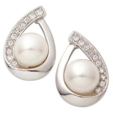 Tomorrow meets the past with a unique melding of diamonds, pearls and silver. Pearl and diamond earrings, .10twt round brilliant cut diamonds, 6mm cultured pearl, 10k white gold. Matching necklace JN566-W and ring JR566-W.