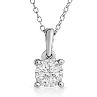 Shimmering diamond solitaire pendant, containing a .50ct round brilliant cut diamond set in a diamond cut sterling silver setting. The pendant is suspended from an 18" cable chain with a lobster claw clasp.