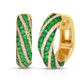 Discover the epitome of elegance with our Striped Diamond and Emerald Hoop Earrings, exquisitely handcrafted from 14k yellow gold. Their unique design features a mesmerizing twisting pattern, artfully alternating between sparkling rows of diamonds and vibrant emeralds. These luxurious hoops are perfected with a secure hinged closure, ensuring they're not only a dazzling addition to your collection but also a comfortable and safe choice for daily sophistication.116 diamonds, .32twt round cut diamonds, 80 emeralds, gold weight: 4.35 grams