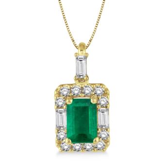 Opt for show-stopping elegance with this 14k yellow gold necklace boasting a 6x4mm emerald-cut emerald that flaunts a dramatic green hue. Framed by round and baguette-cut diamonds, perfectly pavé and prong-set in shimmering gold, the eye-catching gleam of the diamonds and yellow gold gorgeously complement the emerald's color. 18" cable chain with a lobster claw clasp. .33twt round and baguette-cut diamonds. Matches well with earrings JE849-EM-Y and ring JR849-EM-Y.