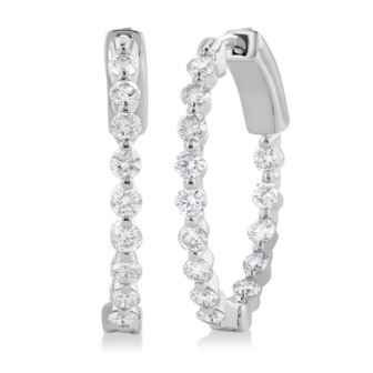 Gorgeously shimmering and timelessly elegant, these 1.00twt eternity hoop earrings feature round brilliant cut diamonds that are mounted in prong settings and appear to be floating in a mesmerizing pattern. These diamond inside out hoop earrings in 14k white gold are designed to steal the show.21mm hoops.