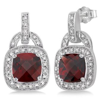 Majestic and bold genuine 8mm cushion cut garnets set in sterling silver with .08twt round diamond accents. Matches well with necklace JN139-GAR and ring JR139-GAR.