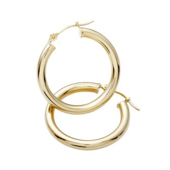 Fun, fashionable yellow gold hoop earrings. 14k yellow gold. 3 x 25mm classic bright hoops.