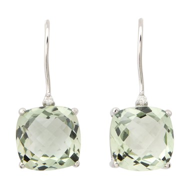 Spectacular 10mm genuine cushion cut green amethysts earrings with .03twt round diamond accents set in sterling silver with French wires. Matches well with necklace JN790-GAM.