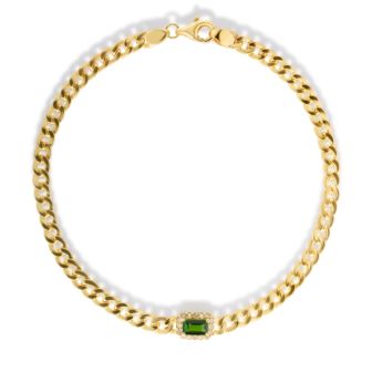 Adorn your wrist with captivating luxury. Our Bezel Set Green Diopside Curb Bracelet features a vibrant 3x5mm genuine green diopside, framed by a delicate halo of pavé white topaz. The substantial 18k yellow gold-plated sterling silver curb chain offers a bold contrast. At 7.5", this statement piece fuses contemporary style with timeless elegance.