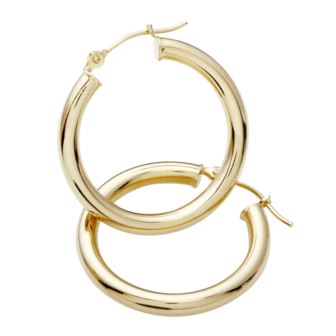 Fun, fashionable large yellow gold hoop earrings. 14k yellow gold. 3 x 40mm classic bright hoops.
